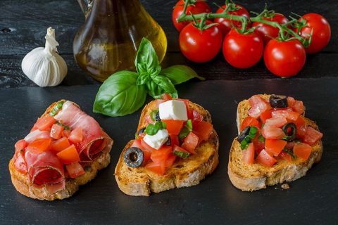 Bruschetta with tomato and basil. fresh tomatoes with garlic, basil, olive oil, served on toasted Italian bread.
