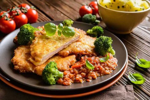Breaded, butterflied chicken breast cooked with capers, lemon juice and fresh parsley something else.